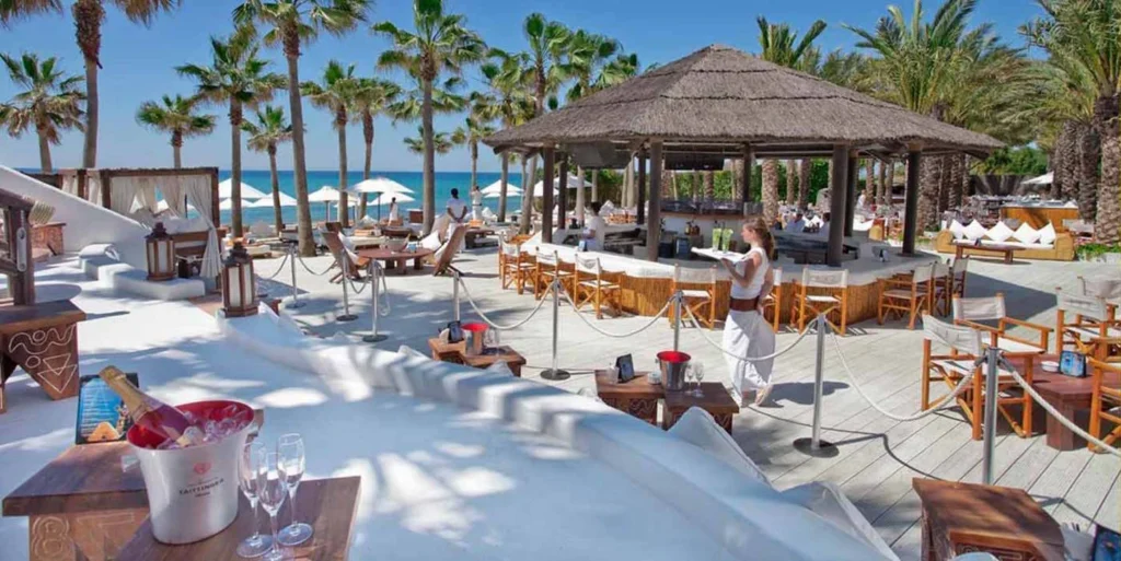 Nikki Beach Marbella features a modern and sophisticated design, with white furniture, palm trees, and stunning beachfront views. The club is renowned for its high-end services, elegant sun loungers, private cabanas, and an impressive pool, making it an ideal spot for sunbathing and relaxation.